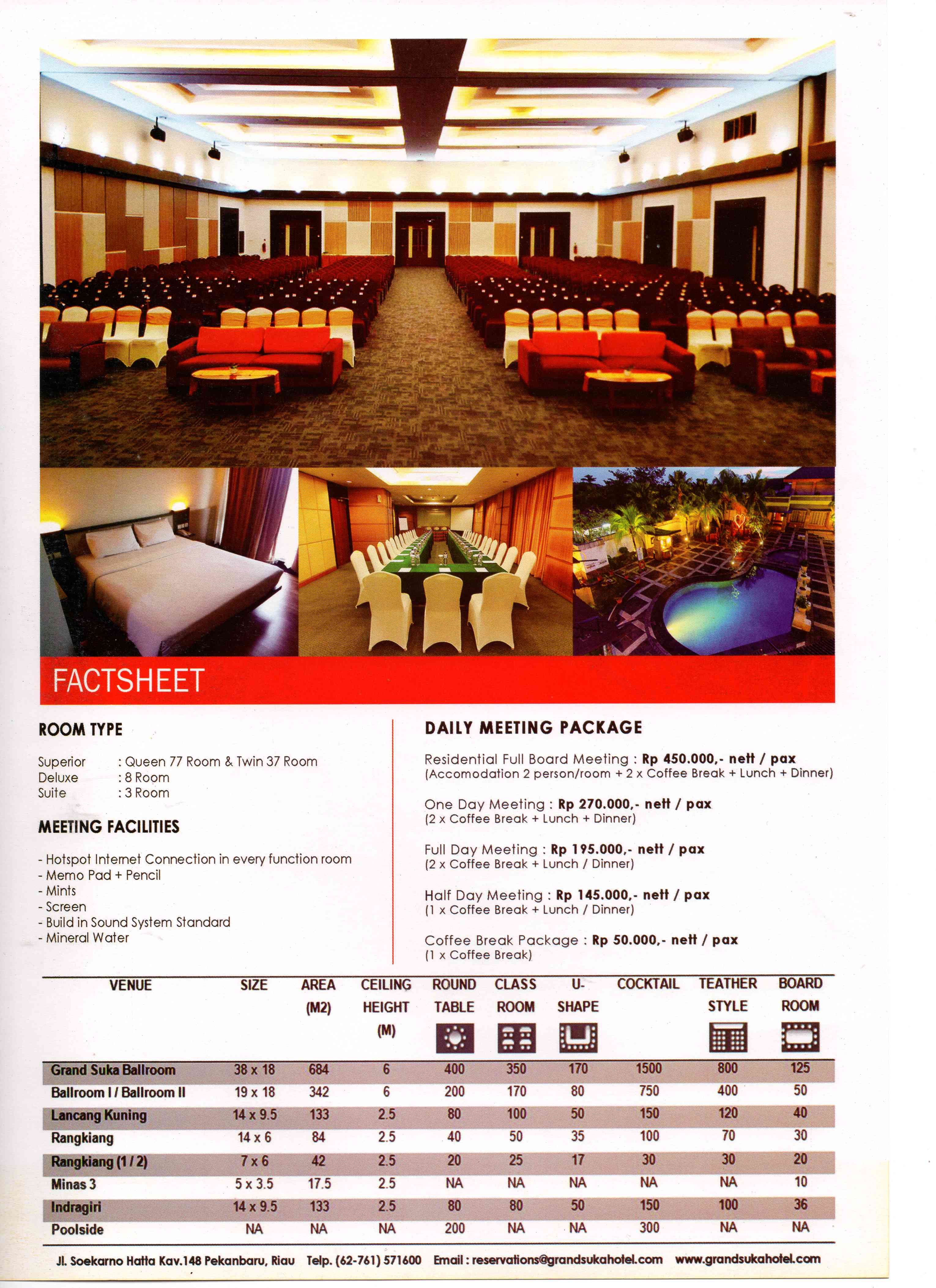 Suasana Grand Suka Hotel tercermin di setiap kamarnya. televisi layar datar, AC, layanan bangun pagi, meja tulis, mini bar hanyalah beberapa dari fasilitas yang dapat Anda nikmati. Disamping itu, hotel memiliki berbagai pilihan fasilitas rekreasi yang menjamin Anda melakukan bermacam hal selama menginap.