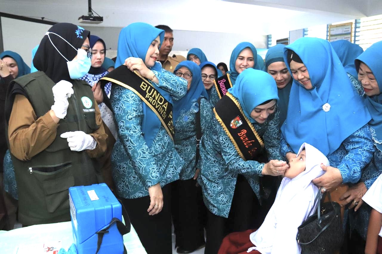 PEKANBARU- Penjabat (Pj) Ketua TP PKK Kota Pekanbaru Aemi Octawulandari Risnadar mendampingi Penjabat Ketua TP PKK Riau Zuliana di SD Negeri 97 Pekanbaru, Jalan Mangkubumi, dan Posyandu Bunga Jajar Kembar, Gang Obor, Jalan Yos Sudarso, Kelurahan Umban Sari, Kecamatan Rumbai, Selasa (17/9/2024). Mereka mengajak murid SD yang berusia di bawah delapan tahun untuk mengikuti imunisasi Polio.