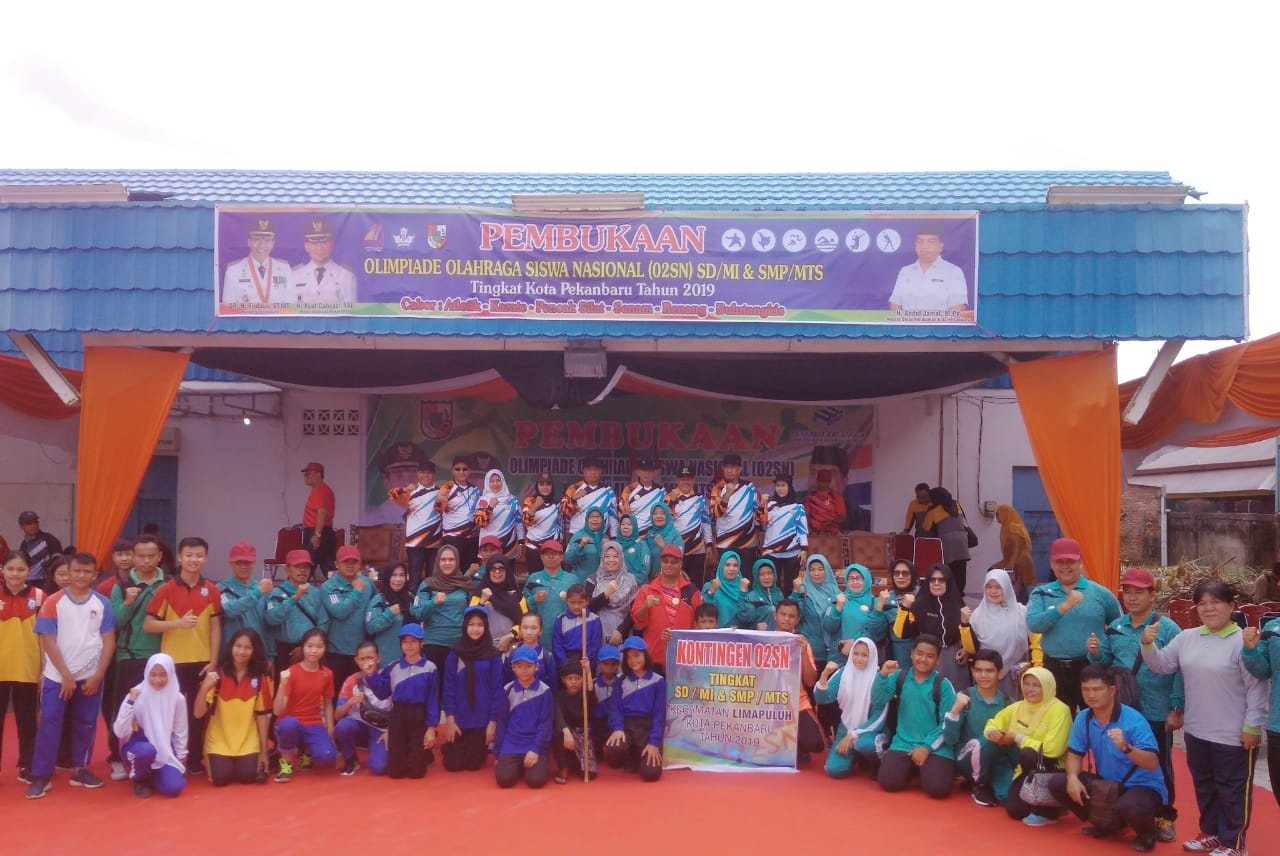 PEKANBARU-- Kepala Dinas Pendidikan Kota Pekanbaru, H Abdul Jamal MPd, didampingi Kepala Dinas Pemuda dan Olahraga Kota Pekanbaru, Zulfahmi Adrian membuka kegiatan Olimpiade Olahraga Siswa Nasional (02SN) tingkat SD/MI dan SMP/MTS se-Kota Pekanbaru, Rabu (19/6).