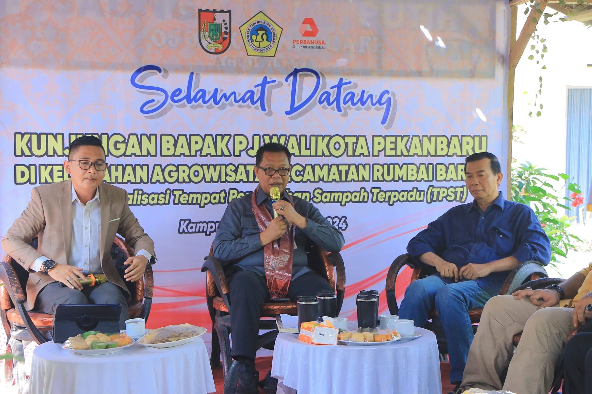 PEKANBARU - Sekretaris Daerah Kota (Sekdako) Pekanbaru Indra Pomi Nasution meninjau lokasi yang akan dibangun Tempat Pengolahan Sampah Terpadu (TPST) di Jalan Sri Sejahtera, Kelurahan Agrowisata, Kecamatan Rumbai Barat, Jumat (12/7/2024). Pembangunan TPST ini kerja sama antara Kontak Tani Nelayan Andalan (KTNA) dengan Perkumpulan Pengelola Sampah dan Bank Sampah Nusantara (Perbanusa).